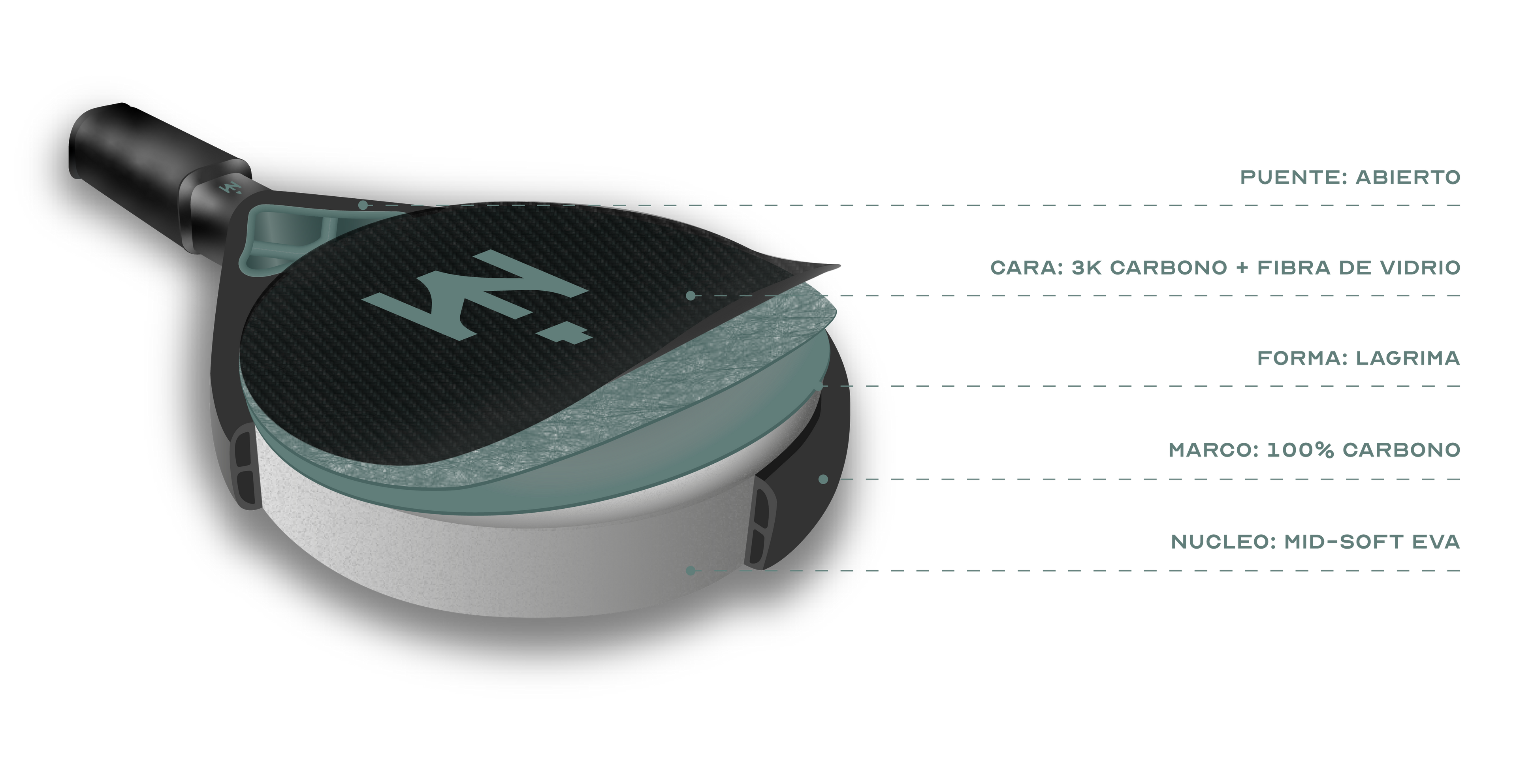 De superficie rugosa y forma de lágrima, entrega un punto dulce un poco más elevado del centro de la pala, lo que se transforma en más potencia en comparación a una pala de forma redonda.